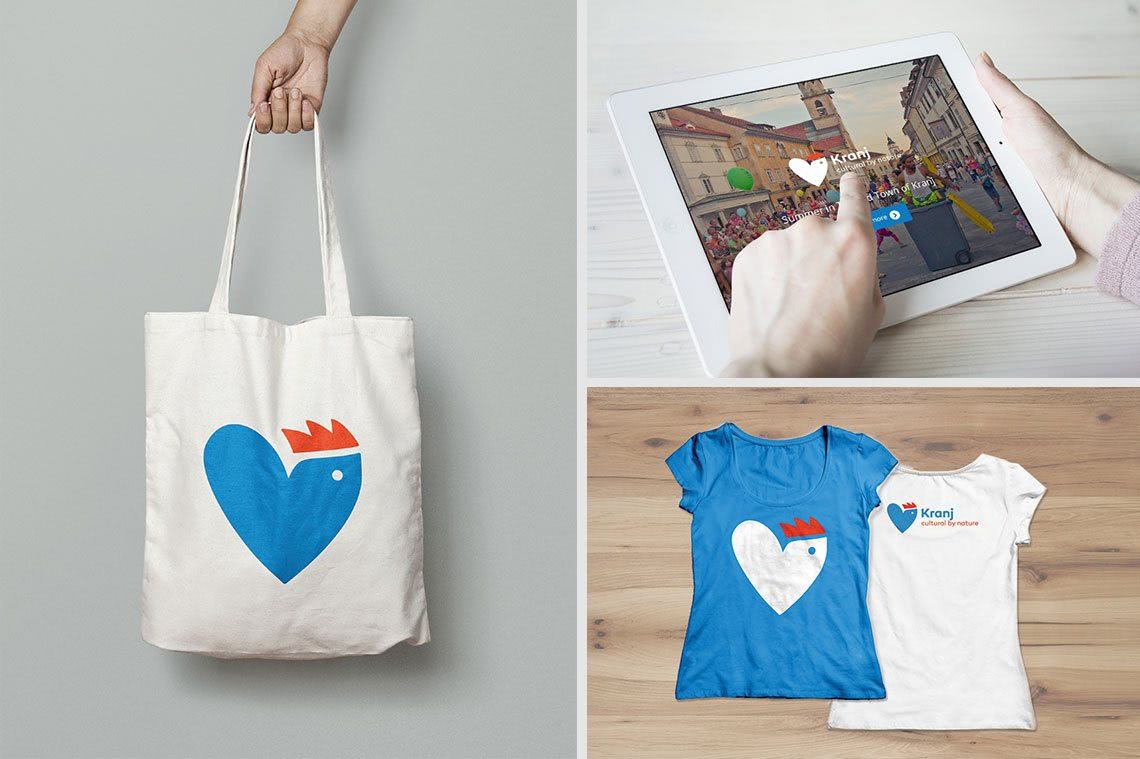 Forming the logo, the primary colours of the visual identity of the Kranj tourist destination were warm bright red and calm light blue. These two colours are directly linked with the heritage of the city of Kranj since its coat-of-arms once consisted of an image of a red eagle on a blue background. Next to that, the red colour of the rooster’s crown represents the colour of the clay-tiled rooftops, while the blue colour of the heart represents the colour of the two rivers that surround the city centre. In addition to the two primary colours, the logo comes in a combination of white and red.