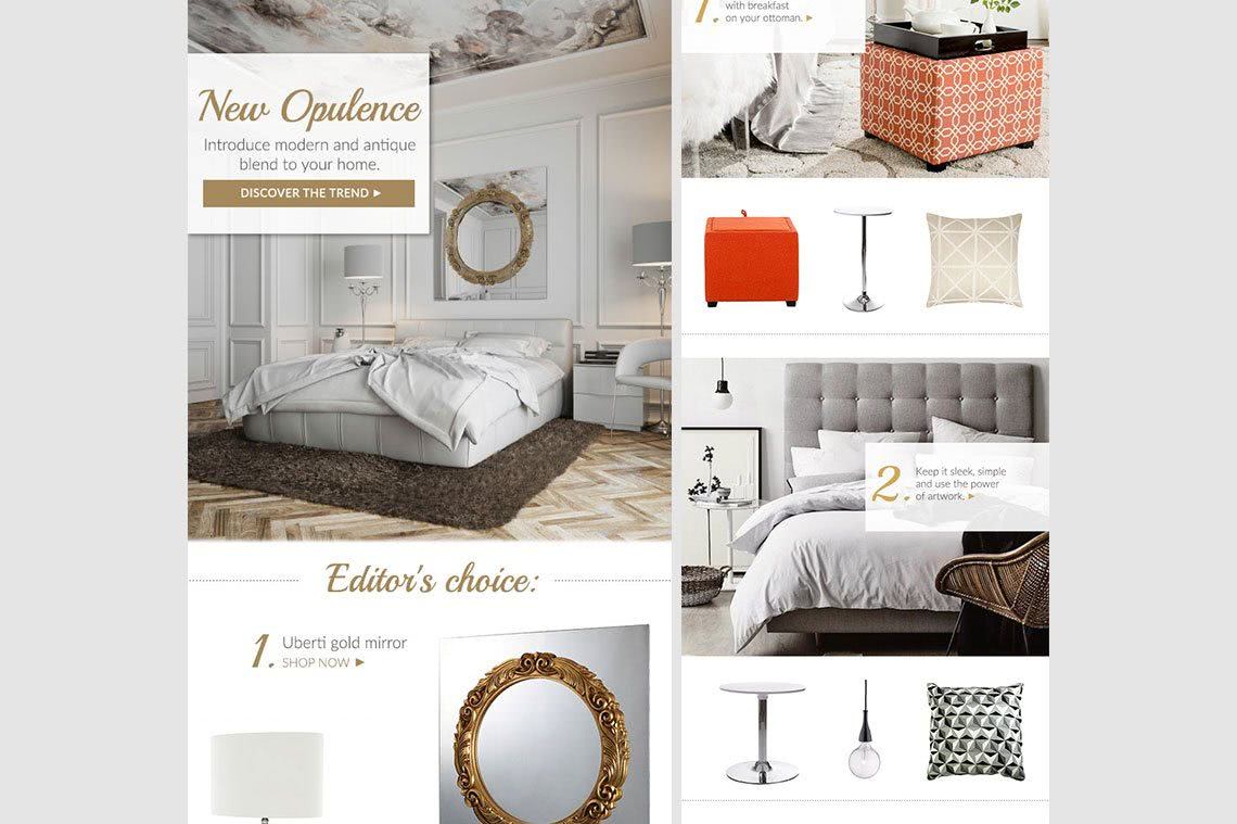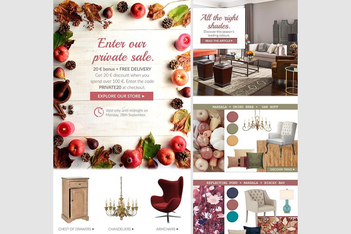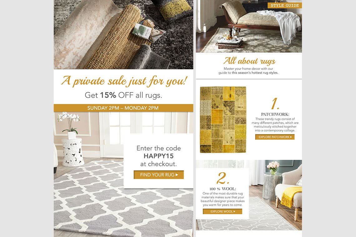 Sometimes, newsletters referred to the same topic. For instance, the first newsletter was more content-oriented (e.g. style guide) with an introduction of ten different sets of top quality rugs. After a week, another newsletter with similar design was sent to announce a special two-day sale of all rugs.