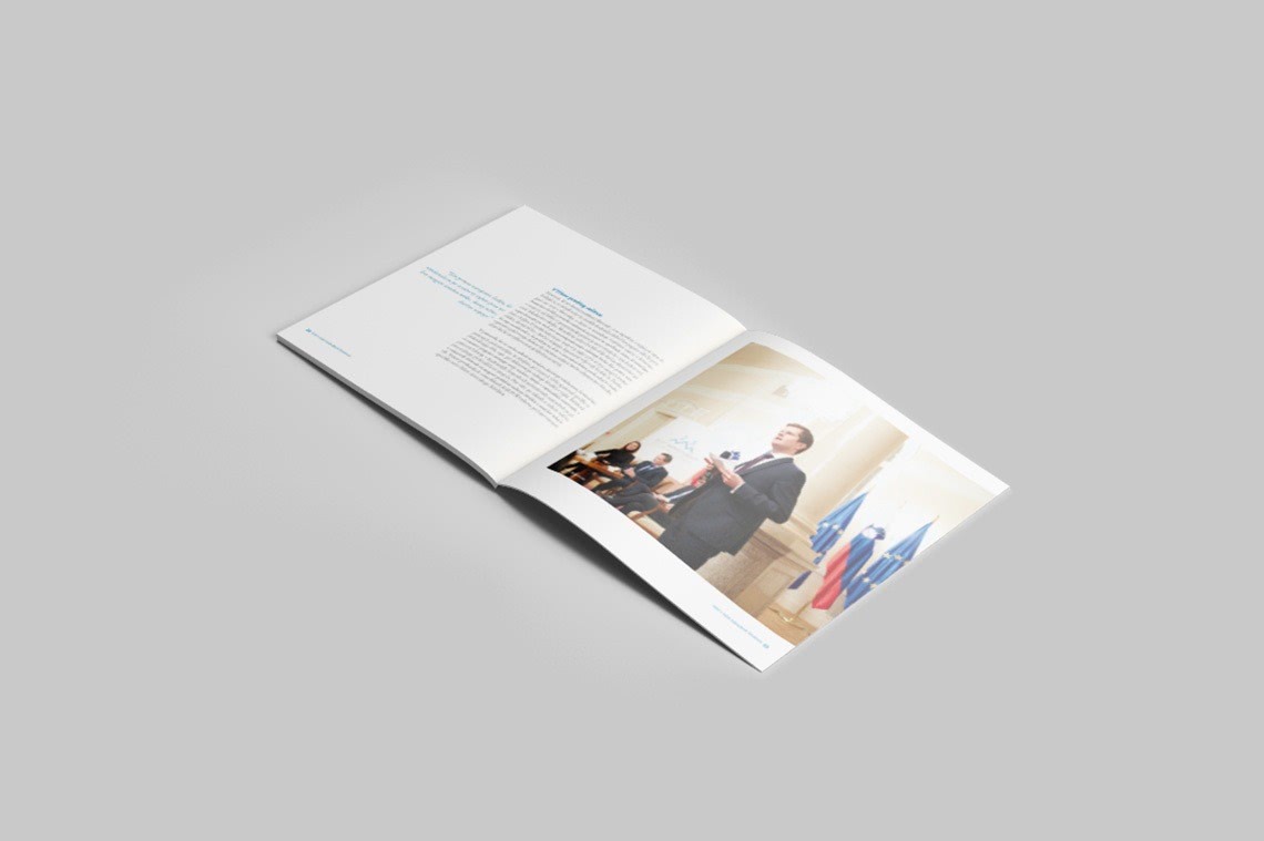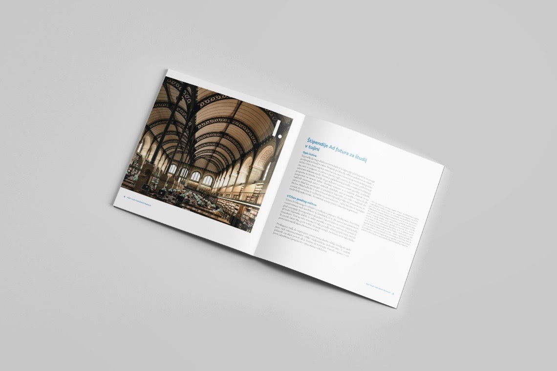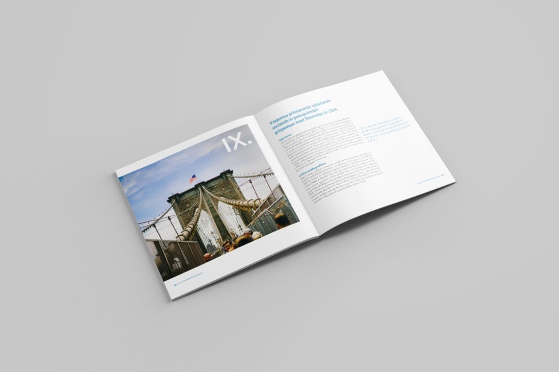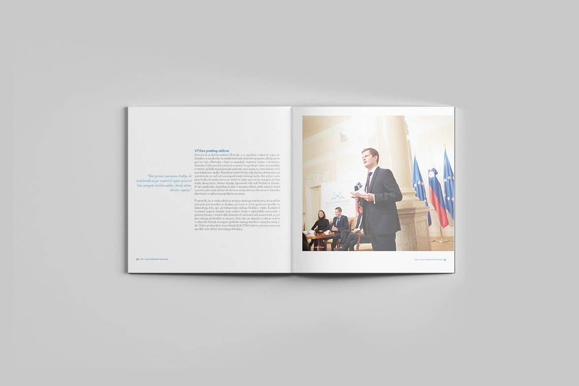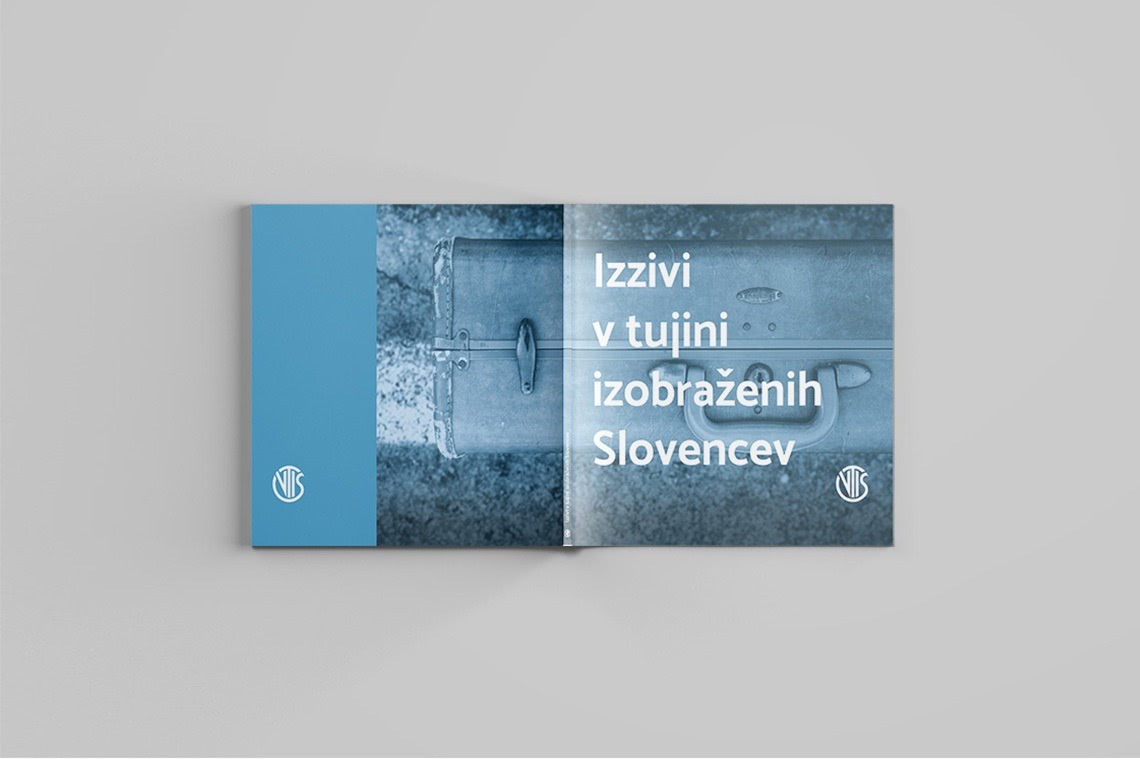Designed layout of the publications is clear and readable for ensuring its formality. The chosen main colour for the publication is blue since it is the significant colour of the association visual identity (its blue logo). Nine challenges have been divided into nine chapters. Within them, the most alarming facts of the knowledge flow issue are graphically especially emphasised with side excerpts to immediately attain the attention of the reader. The bluish photograph of the suitcase which spreads over the front and back cover has been proposed and confirmed since it perfectly captures the theme of the publications. The whole brochure “Izzivi” is available here.